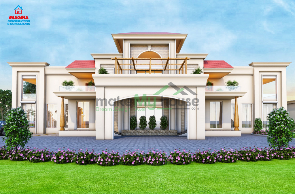 3d double storey bungalow with lavish bedrooms, drawing room, dining room, kitchen, living room and balcony.