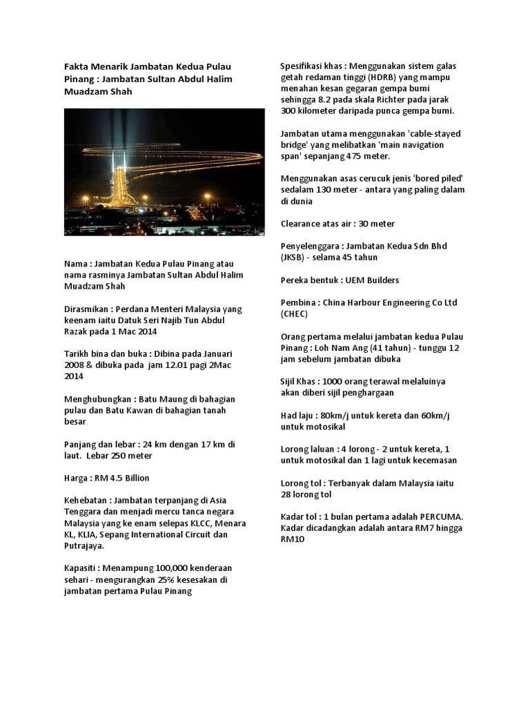 Jembatan ini akan lebih bagus pada malam hari, karena dihiasi dengan lampu. Tindakan ini mungkin mampu meningkatkan penggunaan jambatan kedua dan menurunkan jumlah trafik di jambatan pertama. Perdana menteri malaysia yang keenam iaitu datuk seri najib tun abdul razak pada 1 mac 2014 tarikh bina dan buka : Dia resmi dibuka pada 14 september. Nasib baik ada polis bantuan ni jambatan kedua pulau pinang atau nama rasminya jambatan sultan abdul halim muadzam shah ialah sebuah jambatan tol. Pembangunan jembatan suramadu yang diresmikan pada 2009 ini diharapkan bisa mempercepat pembangunan ekonomi di pulau madura. (ia adalah yang paling panjang sebelum wujudnya jambatan kedua pulau pinang iaitu jambatan sultan abdul hamid mu'adzam shah). Amran hazali telah menyerahkan hamper bantuan makanan kecemasan zpp kepada pegawai daerah yang juga skim bantuan makanan kecemasan zpp 5 jun 2021, kepala batas : Pada pembentangan belanjawan 2020, lim mengumumkan kadar tol untuk kategori kereta persendirian di jambatan kedua pulau pinang akan dikurangkan daripada rm8.50 kepada rm7 bermula 1 januari 2020 bagi menyeragamkan kadar tol di antara jambatan pertama dan kedua. Jembatan penang, pulau penang : Sejarah tentang terbinanya jambatan pulau pinang pertama 1985 dan menjadi antara jambatan terpanjang di dunia. Kes terjun jambatan pulau pinang 1. Sahabat 99, salah satu keuntungan dari kemajuan teknologi adalah kemudahan yang didapat dalam membangun sesuatu, tak terkecuali dalam.